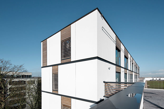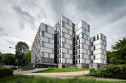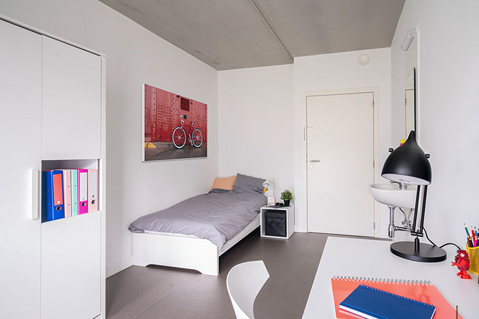 365 is the ideal place for studying. The site includes more than 300 student rooms, a study room of 300 sqm, a laundry, 8 apartments and 5 furnished studios for professors/assistants, a nursery with a capacity for 36 babies/toddlers, an office, bicycle and car parking spaces and a snack food restaurant. The nursery is well separated from the student rooms and causes no noise pollution to the students.